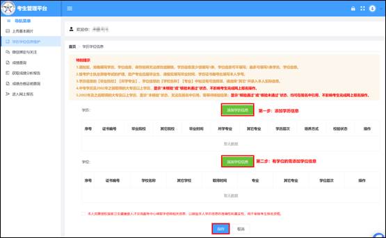 请仔细阅读特别提示内容,按要求添加学历或学位信息,添加完成后点击【保存】按钮,完成学历或学位信息的维护。