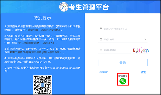 考生微信绑定成功后,可以在考生管理平台登录页面点击